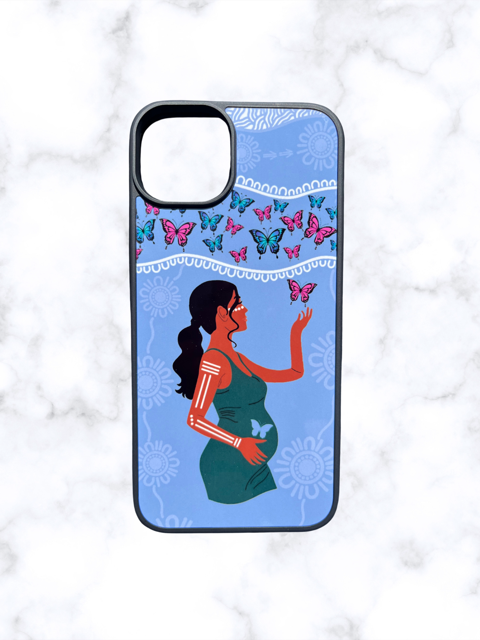 Dreamtime blessing represents the story of a woman going through a miscarriage. The butterfly is a symbol of the baby flying up to the dreamtime with everyone else. The yarning circles symbolise family and friends showing support and love in these difficult times.